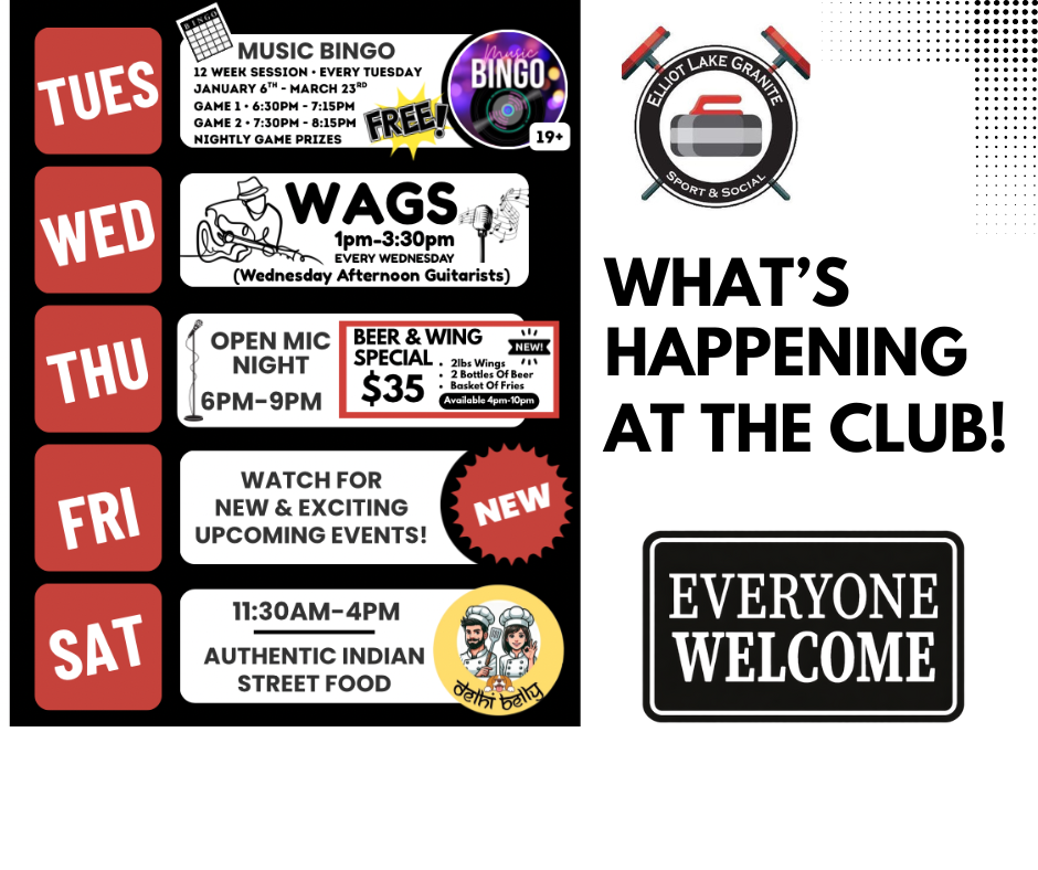 Whether you’re here for curling, catching up with friends, or just great food and drink, the upstairs lounge at the Elliot Lake Granite Sport & Social Club has something happening almost every day of the week. Everyone is welcome!